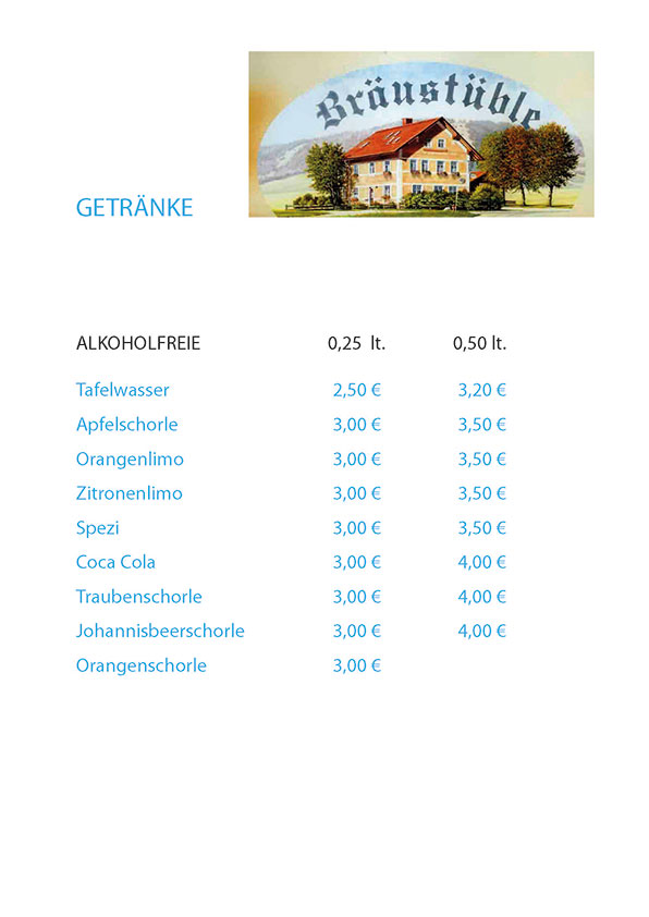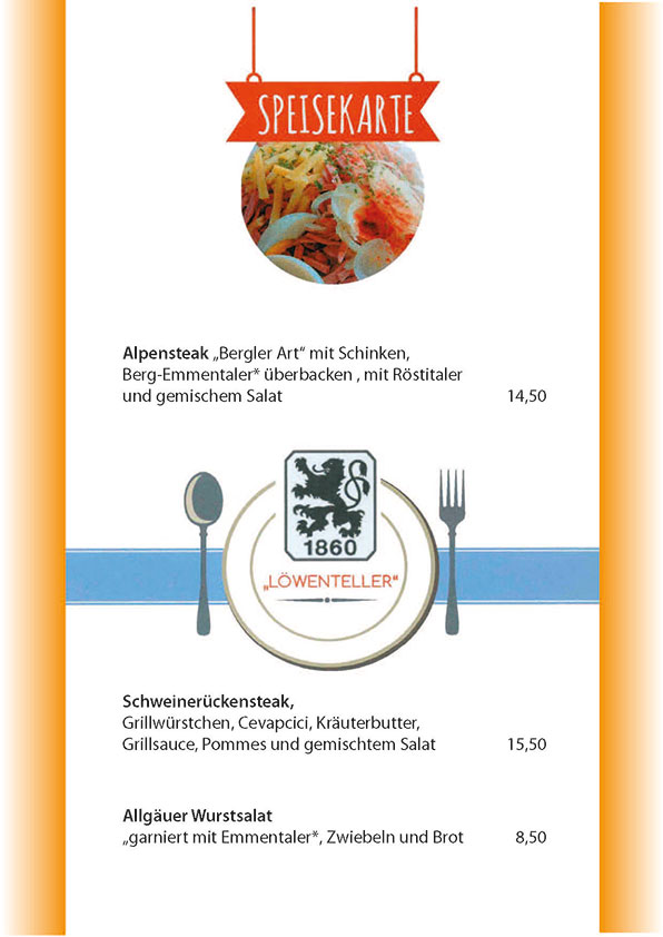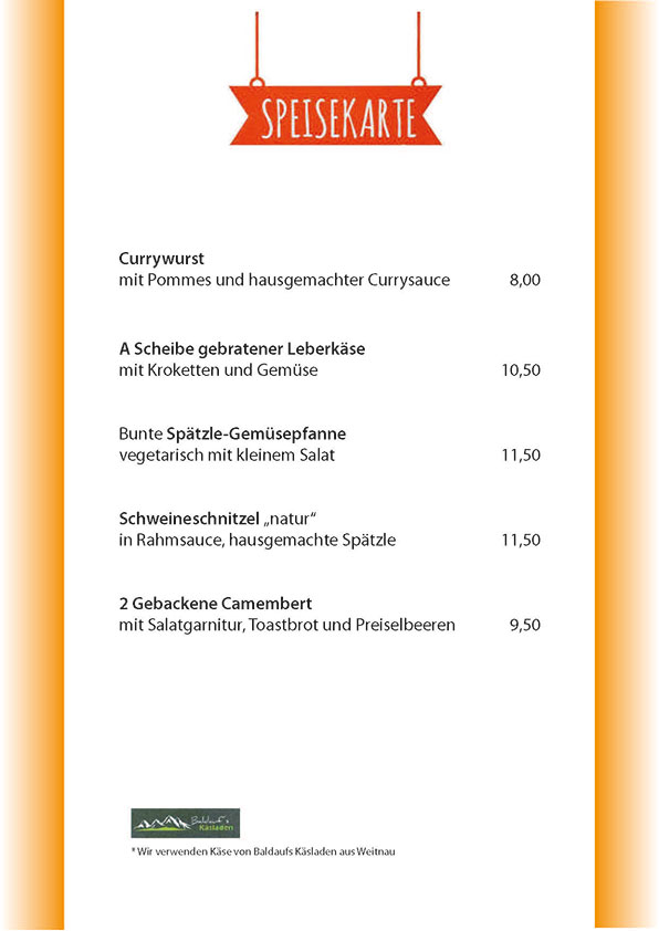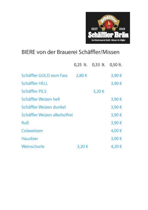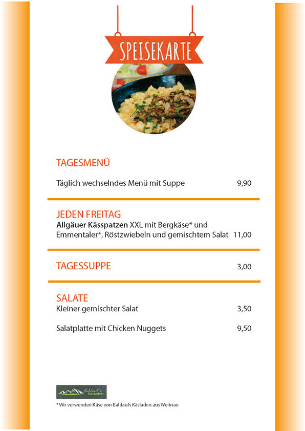 Unser Bestreben ist es , Ihnen eine reichhaltige Speisekarte anzubieten. Dabei stehen Allgäuer Gerichte besonders hoch im Kurs. Falls Sie Änderungswünsche haben, lassen Sie es mich wissen. Ich bin bemüht, Ihren Wünschen gerecht zu werden.